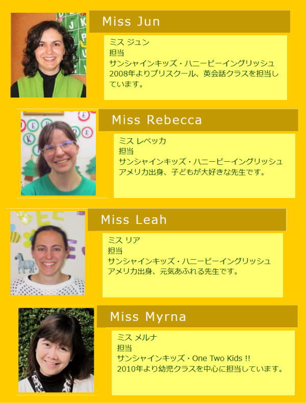 私たちのベテランJunとMyrnaもこれまでの豊富な経験も活かして、ハニービーはより生徒さんたちに楽しみながら深く英語を学んでもらえるスクールを目指しています。